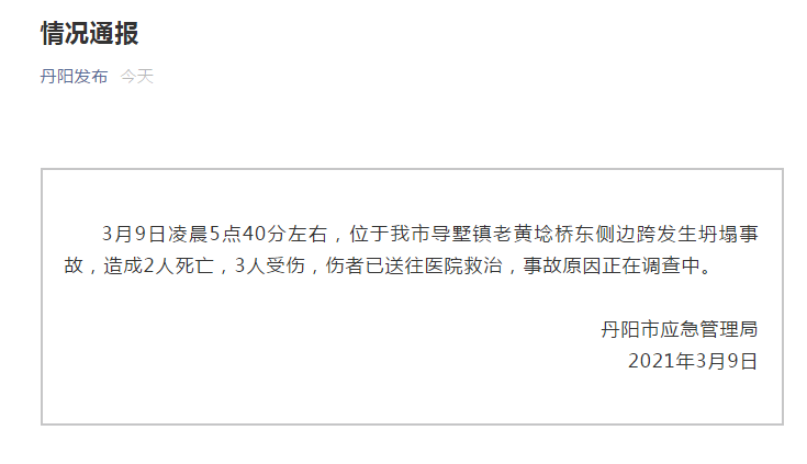 2021年3月9日,我市导墅镇老黄埝桥东侧边跨坍塌事故,造成2人死亡、3人受伤,相关情况续报如下:
