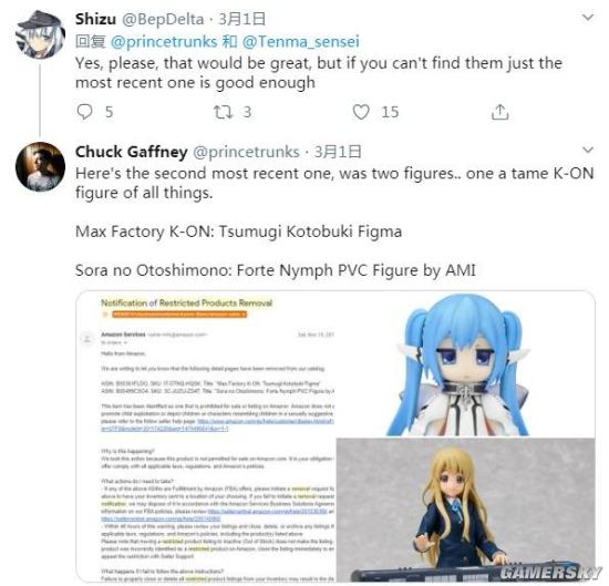 一名名为Chuck Gaffney的销售动漫周边的推特网友称他收到美国亚马逊的通知,要求自己下架Max Factory的初音未来HSP版、Tony版,Max Factory的琴吹紬Figma,妮姆芙等手办。