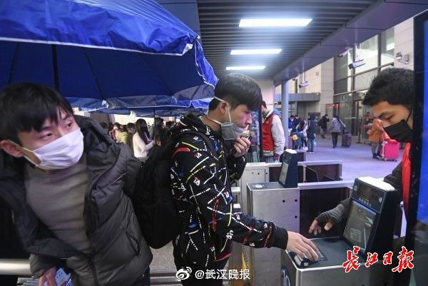 23日,武昌站西广场上,环卫工人在广场上喷洒消毒药水清洁。8时许,武昌站西广场上,旅客等候网约车。不少旅客排队进站乘车。(记者苗剑 摄影报道)