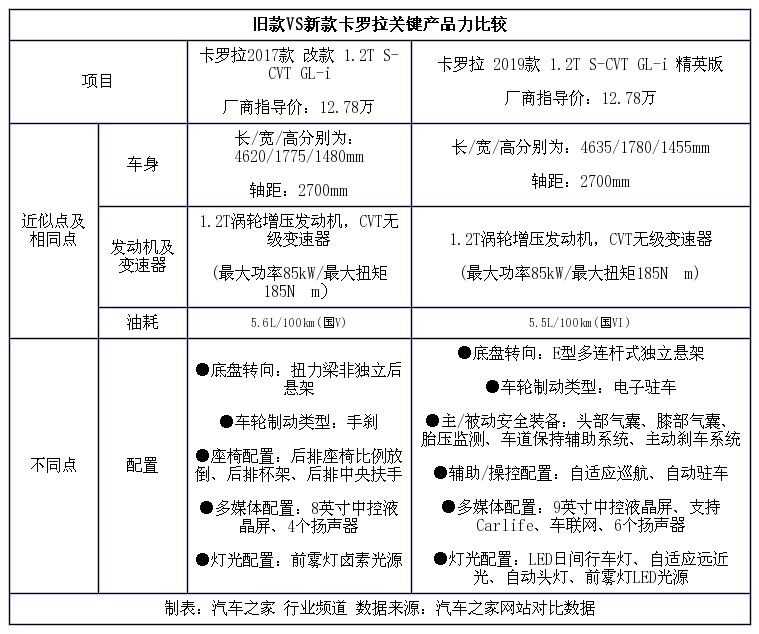 结合前文及汽车之家车主评价中,对旧款车型评价一般的内饰、舒适性及安全担忧等问题,全新卡罗拉在内饰上提高了中控液晶屏的尺寸并应用更多多媒体功能,在底盘上更换为独立悬架,在安全方面增装了头部气囊、主动刹车等主被动安全功能。但同时,此消彼长,全新卡罗拉也在座椅方面的功能上进行了适当减配,如取消了旧款车型的后排座椅比例放倒、后排扶手等。