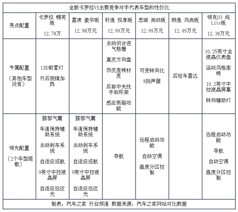 总结:同样以新款车型的主力版本为基准,与其他相似价位的竞争对手相比,全新卡罗拉主销官方指导价格处市场中游水平。而在配置方面,对比其他竞争对手,其独有的配置只有LED前雾灯和后视镜加热,整体来看与雷凌的亮点配置重叠度很高;但对比其他合资品牌产品,卡罗拉在主被动安全、中控液晶屏等方面的配置优势突出,但同时其他竞争对手也各有特点,如轩逸在内饰座椅等方面就占据竞争上风。此外,中国品牌的领克03,在仪表、中控液晶等内部及多媒体配置上也相对水平更高。