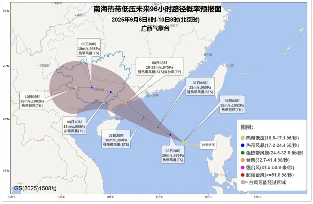 南海热带低压未来96小时路径概率预报图。来源:自治区气象局