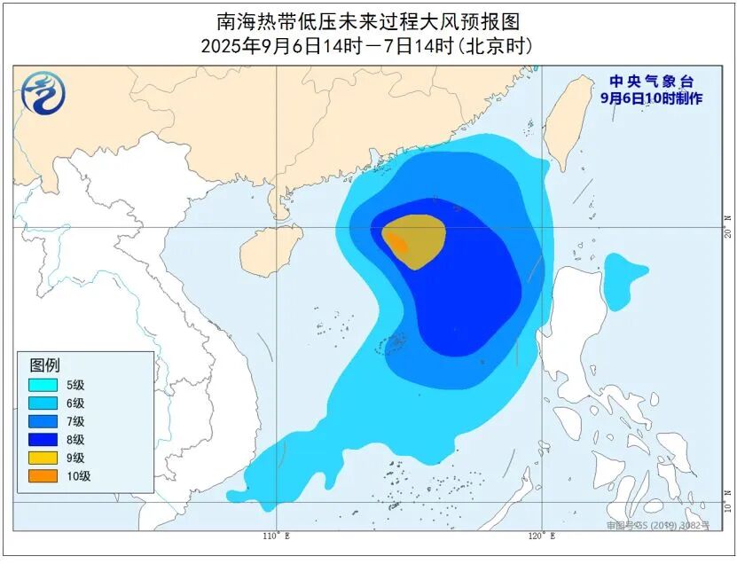 南海热带低压未来过程大风预报图。来源:中央气象台