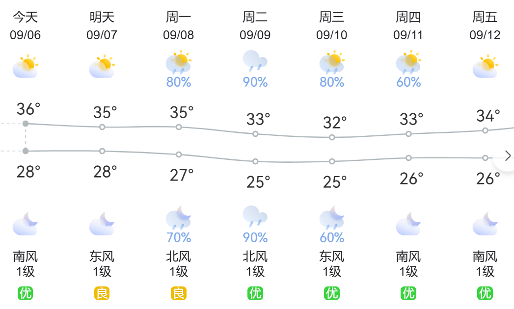 预计未来一周,6~7日我市受副高环流影响,全市以多云天气为主,局地有阵雨或雷雨,大部有35℃以上的高温天气;8~10日受南海热带气旋环流影响,我市有一次中雨、局地大雨到暴雨天气过程;11~12日转受副高控制,我市多云、部分地区有阵雨或雷雨。