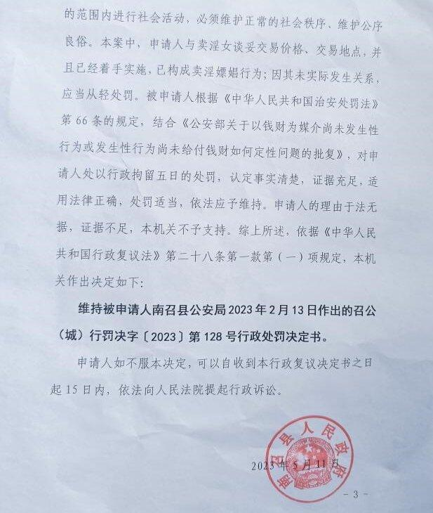 该事件中,公安部门对其作出的行政处罚决定书显示,经查明,翟先生与涉事女子通过招嫖小纸片联系,谈好价格为400元后,约定了交易地点。到交易地点见面后因嫌女方与照片上不一样,未发生两性关系,给了女方100元打发其走人。而翟先生对其行政拘留5日的处罚向南召县人民政府提起行政复议,认为没有完整的性交易,不构成违法。对此,南召县人民政府认为,本案中,翟先生与卖淫女谈妥交易价格、交易地点,并且已经着手实施,已构成卖淫嫖娼行为;因其未实际发生关系,应当从轻处罚。对翟先生处以行政拘留5日的处罚,认定事实清楚,证据充足,适用法律正确,处罚适当,依法应予维持。