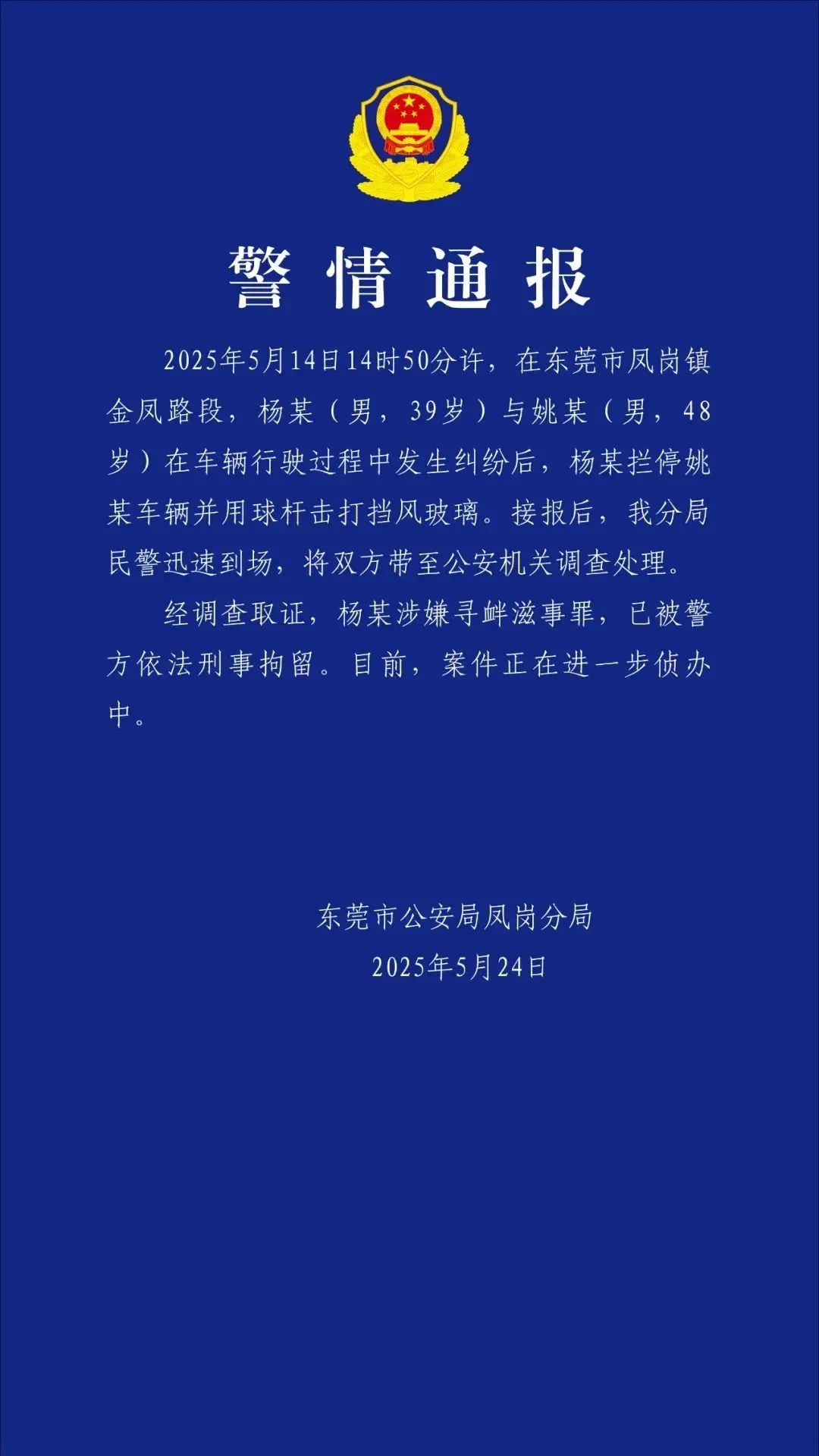 5月24日,广东省东莞市公安局凤岗分局发布警情通报称,5月14日14时50分许,在东莞市凤岗镇金凤路段,杨某(男,39岁)与姚某(男,48岁)在车辆行驶过程中发生纠纷后,杨某拦停姚某车辆并用球杆击打挡风玻璃。接报后,凤岗分局民警迅速到场,将双方带至公安机关调查处理。