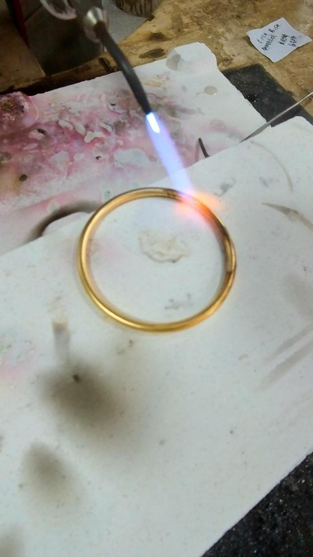图为黄金手镯抹了洗洁精后,在硬火灼烧下会变黑。图片来源:广州日报