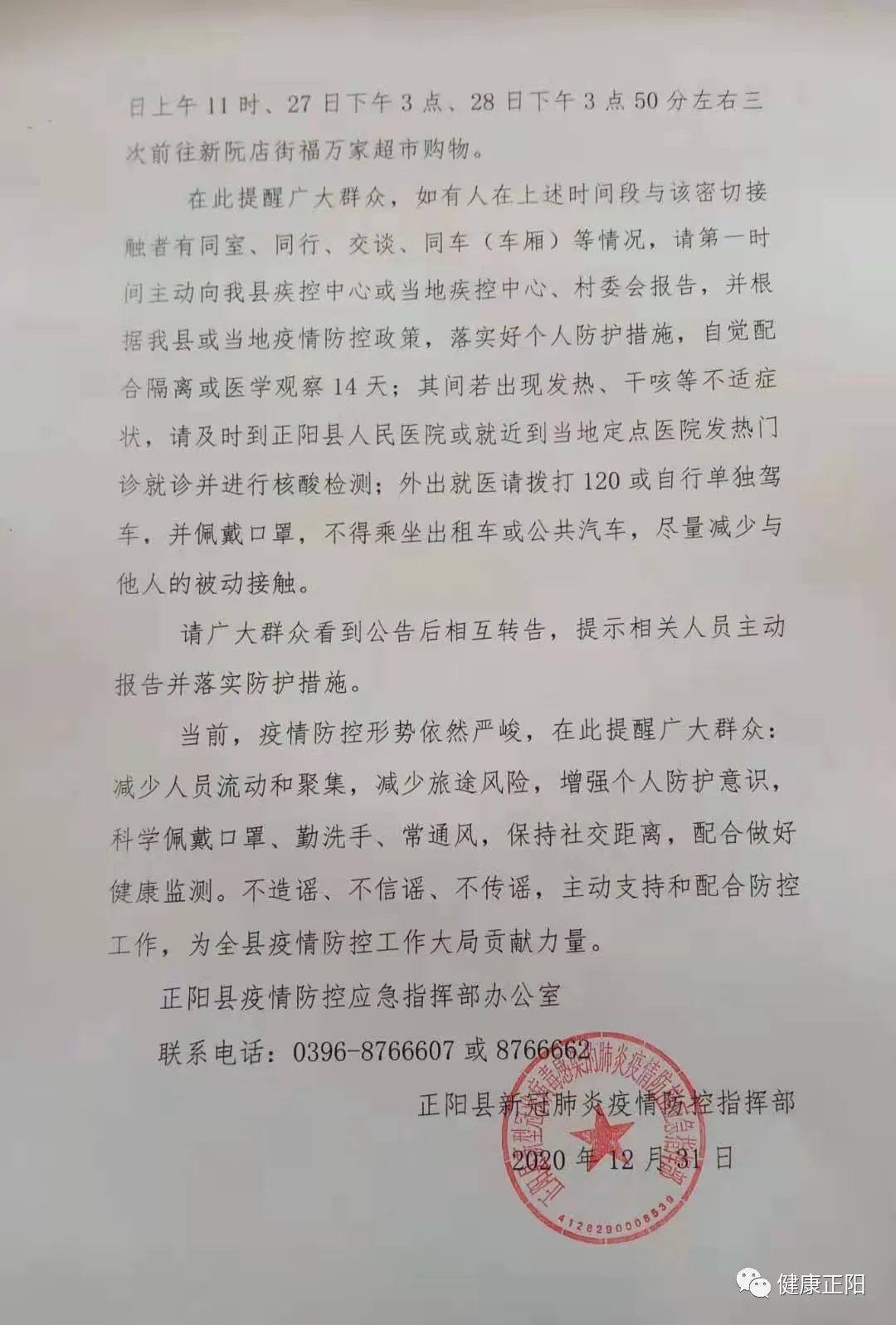 2020年12月29日,杭州市报告1例新型冠状病毒无症状感染者孟X。根据杭州市协查函反馈情况,该感染者有1名密切接触者管XX系我县新阮店乡管寨村人。我县疾控中心及时进行了流行病学调查,并对其进行隔离观察,同时进行核酸检测,12月29日及31日连续两次核酸检测结果均为阴性,目前正在密切观察中,为使公众了解管XX行踪,现将其行动轨迹公告如下: