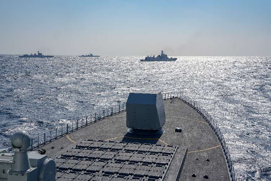 ↑舰艇编队按照预定航线开展编队运动。黄嘉诚 摄