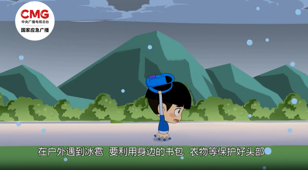 在户外遇到冰雹,要利用身边的书包、衣物等保护好头部,及时躲避到建筑物或坚固的遮挡物下,防止被冰雹砸伤。