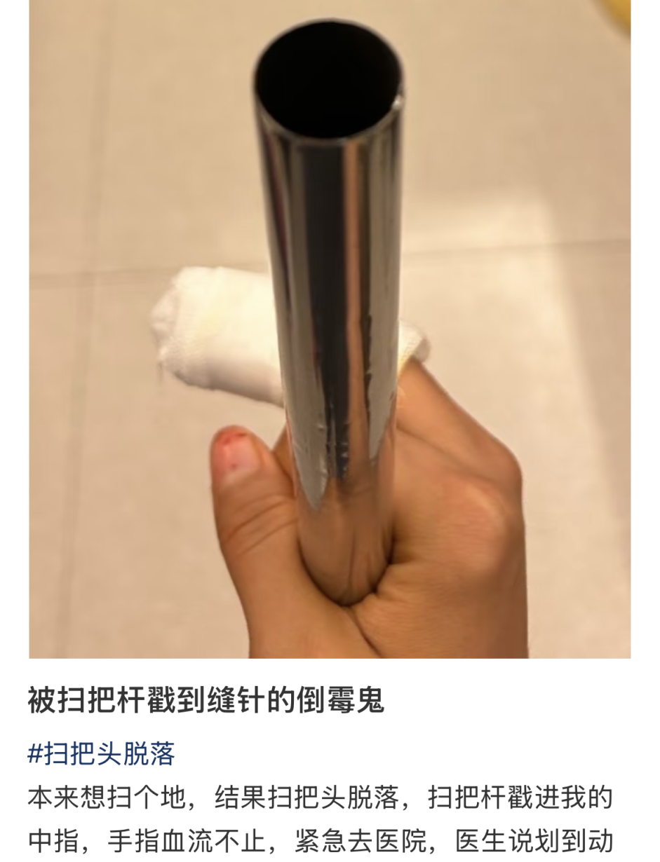 除了手指“伸进去,出不来”外,不少网友还分享了扫把头脱落后,自己被扫把杆割伤、戳伤的经历,看起来十分惊险。