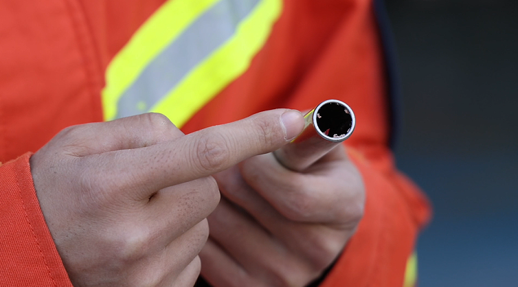 消防员相继取来黄瓜、苹果和猪肉,用来测试握柄端口的锋利性:用钢管端口一划,黄瓜和苹果瞬间被切断;再用它戳向猪肉皮,同样留下明显的伤口。
