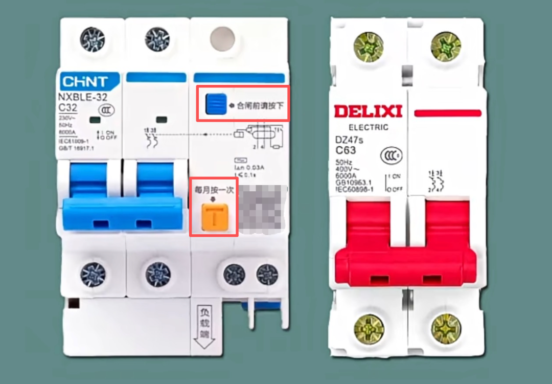 漏电保护开关多了“复位按钮”(蓝色小方块)与“测试按钮”(T键),具备漏电保护功能。当检测到人体触电、火线接地或接零时,会瞬间跳闸,对人身安全的防护性更强。