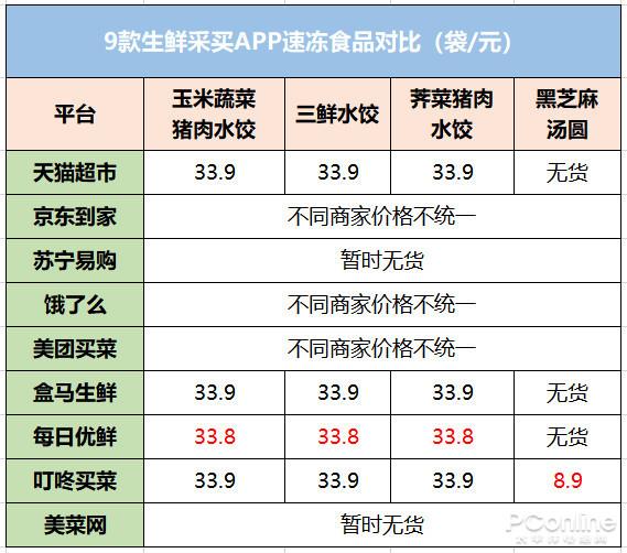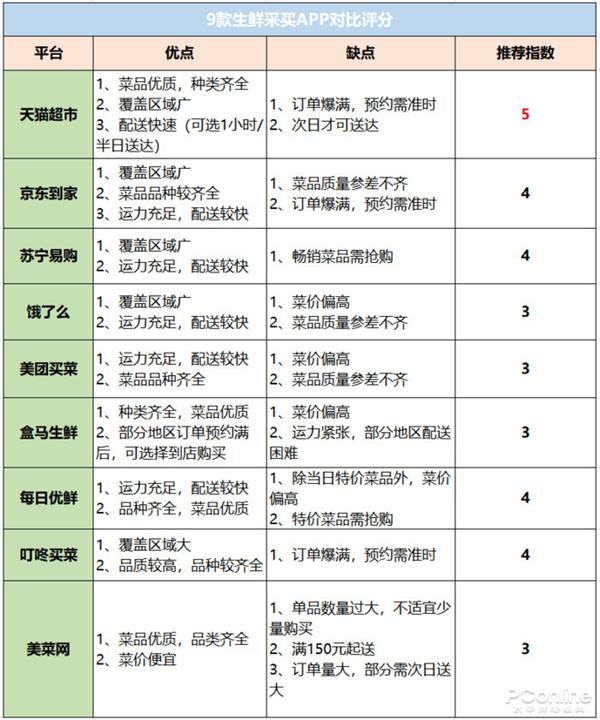 为此,PConline评测室作为善解人意的的小甜心,在近期选取了目前受众较广的9款线上生鲜平台,包括天猫超市、京东到家、苏宁易购、饿了么、美团买菜、盒马生鲜、每日优鲜、叮咚买菜和美菜网,进行逐一对比评测和打分