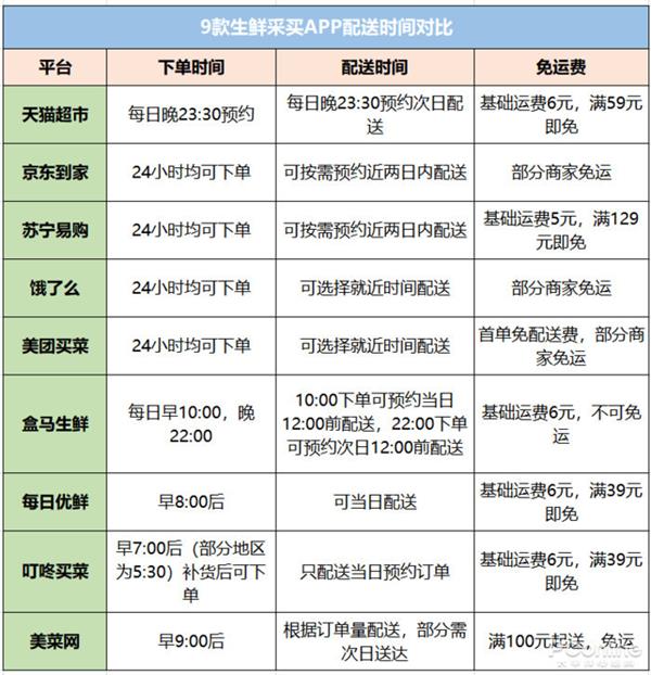 我们对9款生鲜采购平台的下单时间,是否需要预约,配送时间和运费情况做了总结,对比如下图: