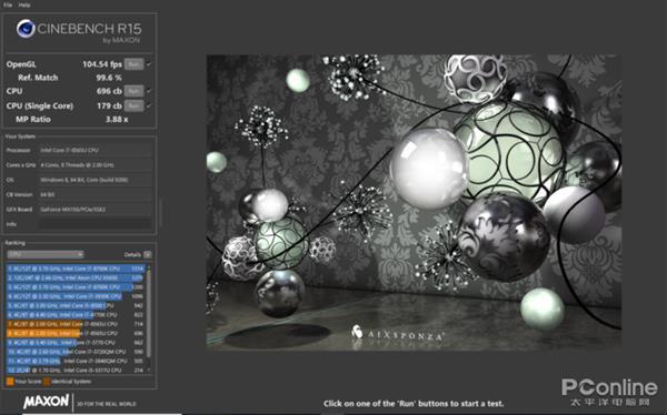 Cinebench R15是一款测试处理器性能的软件,在这款软件中,Intel Core i7-8565U的单核性能跑分成绩为179cb,多核性能跑分成绩为696cb。相较于目前市面主流采用Intel Core i7-8550U处理器的超薄本高出约20%左右水平。