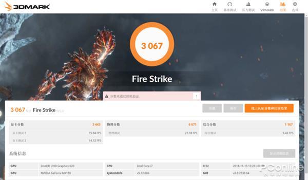 通过3DMARK的Fire strike模式下得到3067分的成绩,比上一代的940MX性能提高了30%左右,相比低功耗MX150性能提高35%左右,相当于GTX 950M显卡的水平。能够流畅运行主流网络游戏和中低画质模式下的3A大作。