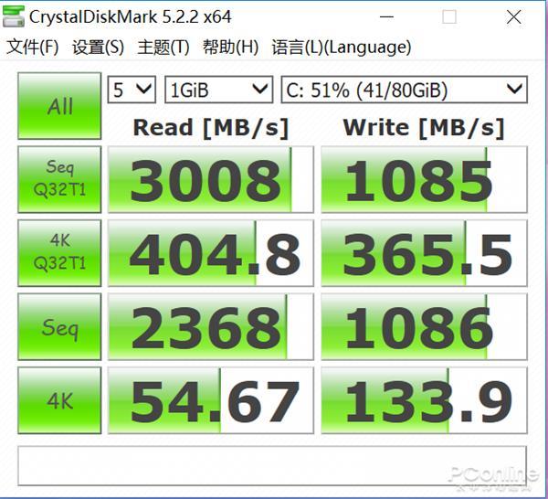 硬盘方面HUAWEI MateBook 13拥有256GB NVMe PCIe固态硬盘,通过CystaDiskMark测试,读取速度为3008MB/s,写入速度为1085 MB/s,在日常使用及传输数据方面具备出色的响应速度。