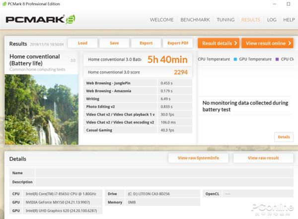 HUAWEI MateBook 13内置了41.838Wh(3670mAh 11.4V)电池,官方给出的数据是一次充电即可播放10小时本地全高清(1080P)视频,我们通过PCMARK 8进行持续使用多应用测试,将亮度和音量调节至50%,最终测试成绩为5小时40分钟,还剩10%的电量,完全能够满足外出工作需求。