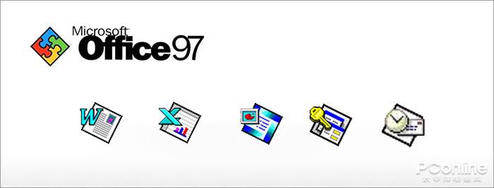 Office 97诞生于1996年,堪称Office历史上第一个经典之作。整体设计沿袭此前的Office 95设计,图标大体模拟了组件功能,用现在的话说,就是纯粹的拟物化设计。而Office 97相比Office 95的最大看点,是整体界面更加养眼和耐看,这在20年多前,还是相当有吸引力的。