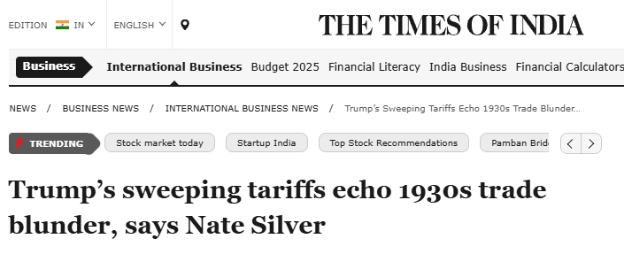 统计学家和政治分析师内特·西尔弗(Nate Silver)5日在社交平台上写道:“天啊,竟然错误地应用了他们那愚蠢至极的公式!”《印度时报》(The Times of India)的报道援引了西尔弗的最新评论文章,他警告称这种激进的贸易政策可能会对美国经济造成严重损害,而且华尔街已经在为这一影响做准备。他指出,这与1930年灾难性的斯姆特-霍利关税法(Smoot-Hawley Tariff Act)如出一辙。