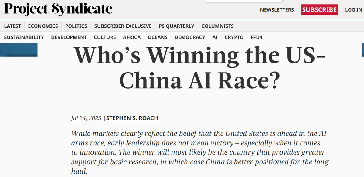 中国日报网7月30日电 美国摩根士丹利亚洲区前主席斯蒂芬·罗奇在报业辛迪加网站(Project Syndicate)发表文章指出,全球人工智能(AI)竞赛的胜负取决于基础研究的投入,而非短期市场表现。罗奇认为,中国凭借产业生态、研发投入和文化传统,使其在长期竞争中占据优势。