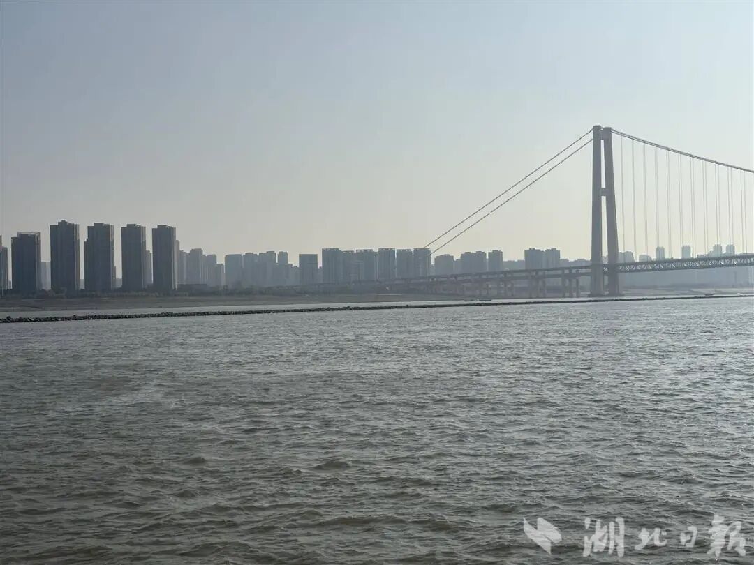 12月13日下午2点,湖北日报全媒记者在鹦鹉洲长江大桥水域看到,这条“江心小路”两侧铺着碎石,将江水一分为二,一直通到近杨泗港大桥处。