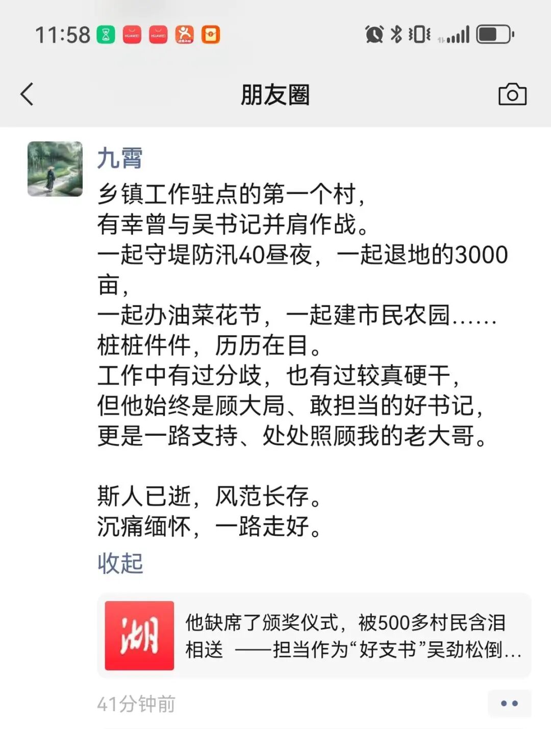 曾与吴劲松并肩防汛40天的程霄,如今是黄州区陶店乡乡长,他在朋友圈发文悼念老大哥。