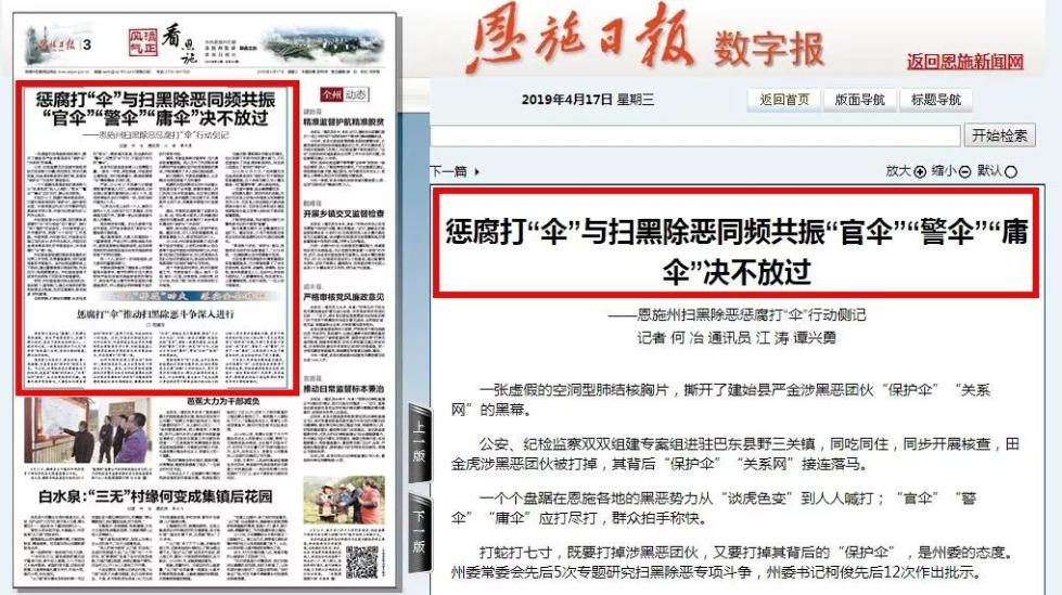 近日,恩施日报以《惩腐打“伞”与扫黑除恶同频共振“官伞”“警伞”“庸伞”决不放过》为题,报道了恩施州扫黑除恶惩腐打“伞”行动中的一些案例。以下为报道详情(有删减)——