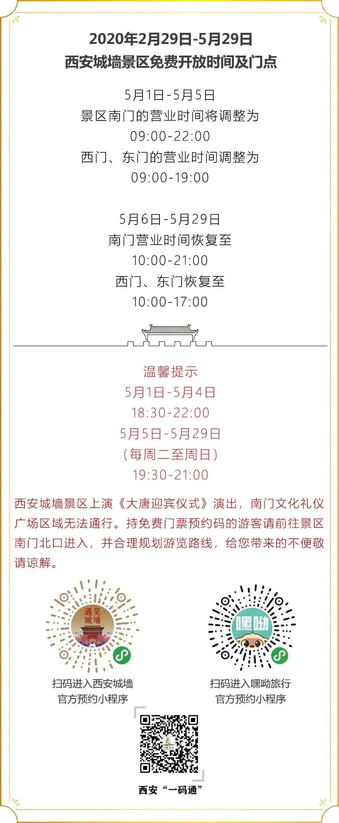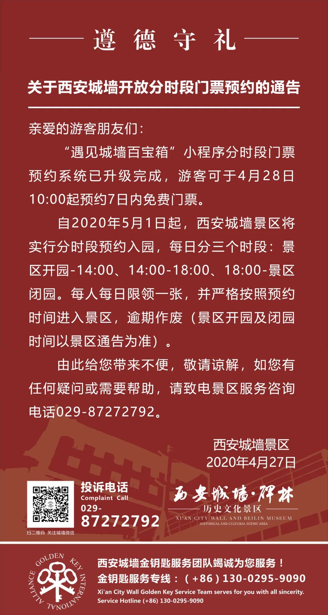 一、即日起,在2020年5月1日—5月5日期间入园的游客可提前在景区官方微信公众号(xahanchenghu)平台上进行实名制预约,每个微信号最多可预约5人。预约游园时间段分为:6:00—12:00,12:00—18:00,18:00—21:00