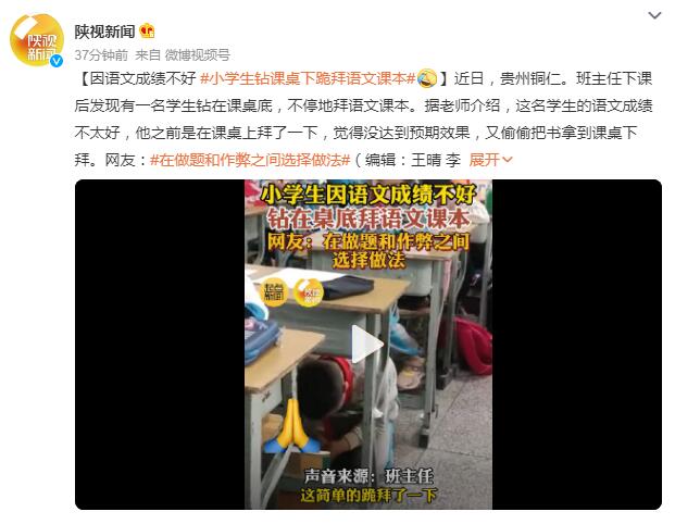 近日,贵州铜仁。班主任下课后发现有一名学生钻在课桌底,不停地拜语文课本。据老师介绍,这名学生的语文成绩不太好,他之前是在课桌上拜了一下,觉得没达到预期效果,又偷偷把书拿到课桌下拜。网友:在做题和作弊之间选择做法。