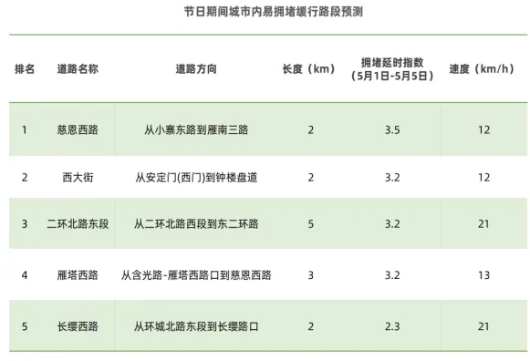 受西兴高速改扩建、包茂高速公路太乙宫至营盘专项维修整治施工影响和节日外地游客多等因素,预计连霍高速、包茂高速、京昆高速、沪陕高速等与西安绕城高速相接的“高接高”路段通行压力较大。