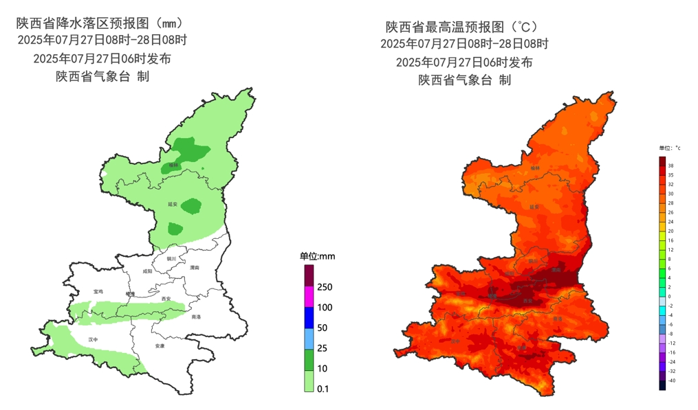 28日:陕北大部有小雨,榆林南部部分、延安北部局地有中雨,关中西部和南部部分、商洛东部、秦巴山区部分有小雨或阵雨。陕北黄河沿线局地、关中平原、陕南河谷地区有35℃以上高温天气,局地可达38℃以上。