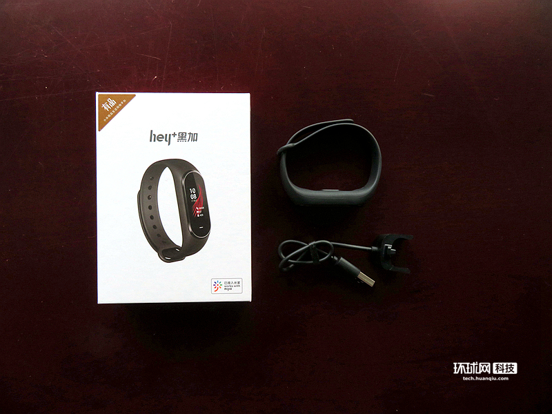 打开包装,我们可以看到黑加手环的“全家福。手环主体,专用充电线。