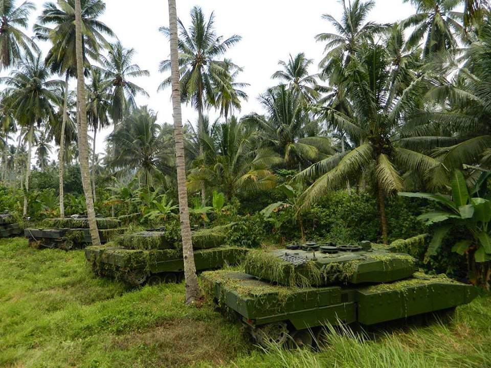 近日一张印度尼西亚陆军坦克部队训练的画面公开,可以看到印尼的“豹”RI坦克采用的绿色涂装在热带丛林地形下伪装效果很好,加上利用一些自然物件作为披挂,几乎与周围环境融为一体。