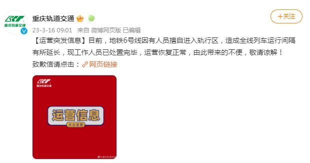 重庆轨道交通:地铁6号线有人擅入轨行区致列车运行间隔延长,现已处置完毕