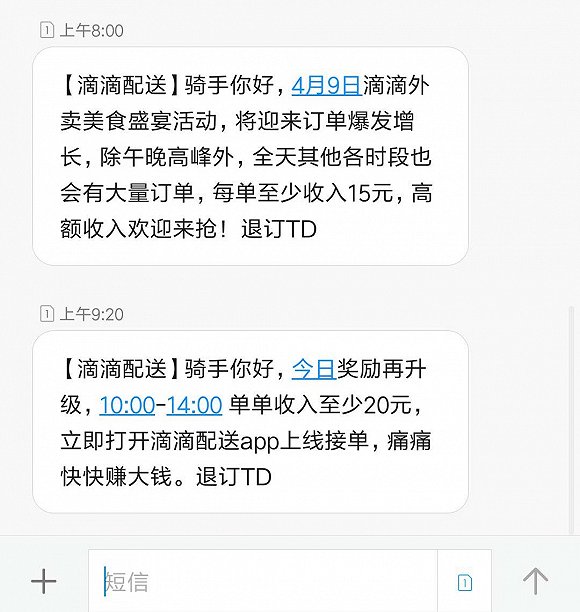滴滴在开城当日向外卖骑手推送的奖励短信。