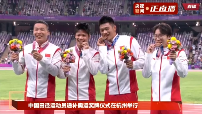 10月4日晚,杭州亚运会田径比赛结束后,中国奥委会在杭州奥体中心体育场举行递补奥运奖牌颁奖仪式。