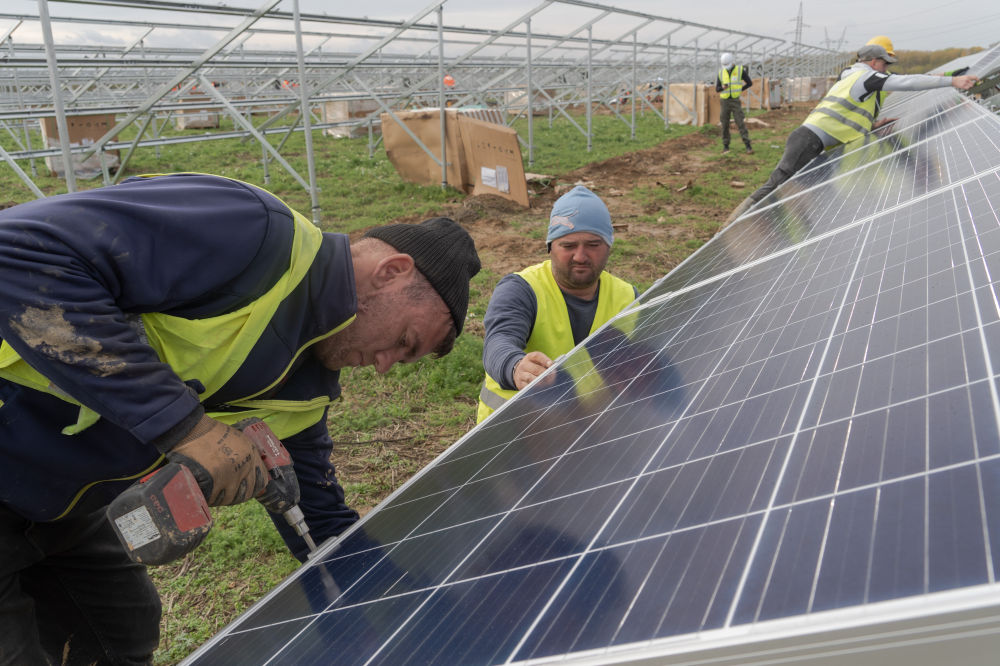 2020年10月30日,在匈牙利考波什堡,工人正在安装考波什堡光伏电站的光伏板。新华社发