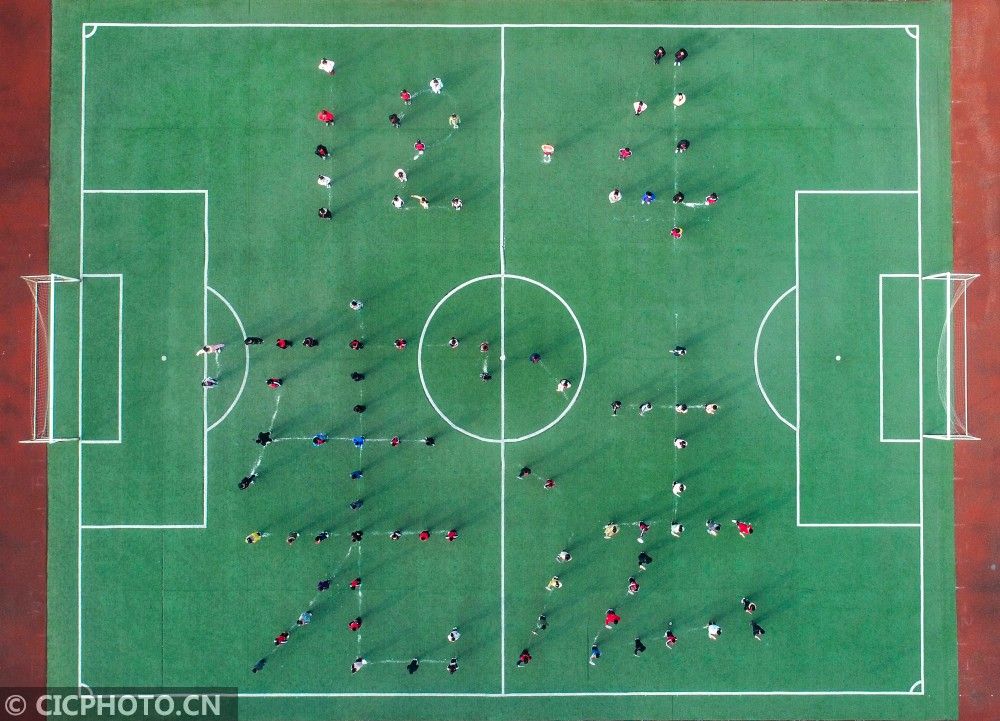 ↑2020年12月3日,江苏省泰州市法制宣传志愿者和大冯中心小学学生在操场组成“12·4 宪法”字样(无人机照片)。CICPHOTO/汤德宏 摄