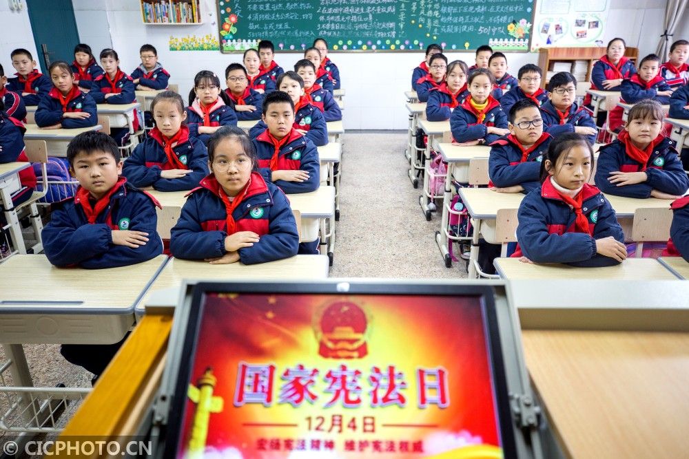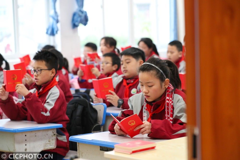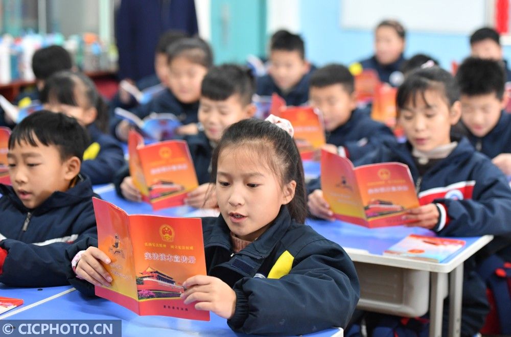↑2020年12月3日,浙江省湖州市德清县武康街道东风小学学生在学习宪法。CICPHOTO/王正 摄