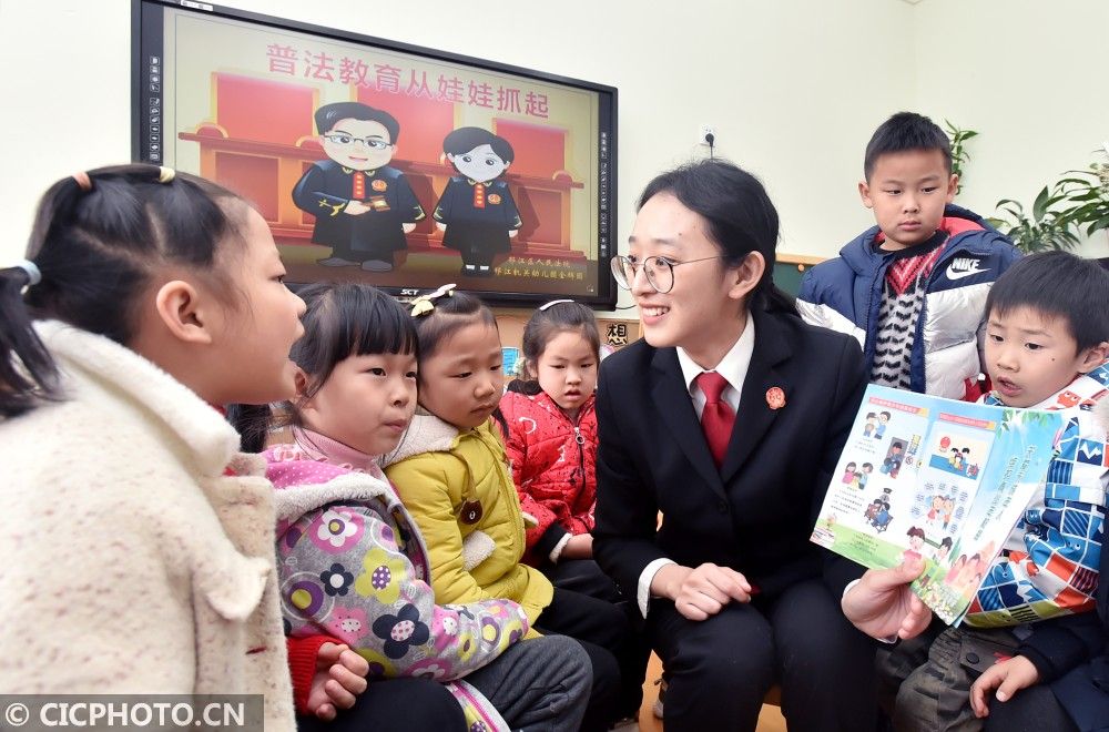 ↑2020年12月3日,江苏省扬州市邗江区人民法院法官通过讲故事的方式,向小朋友介绍基本自我保护常识。CICPHOTO/庄文斌 摄