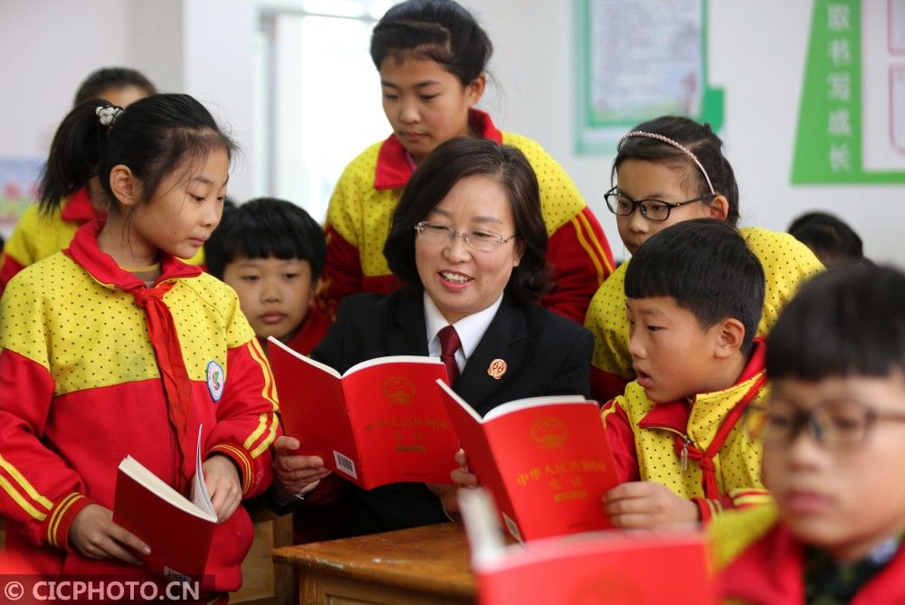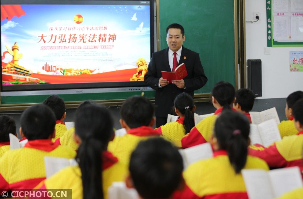 ↑12月1日,在山东省临沂市沂南县苏村镇中心小学,法官为学生讲解宪法读本。CICPHOTO/王彦冰 摄