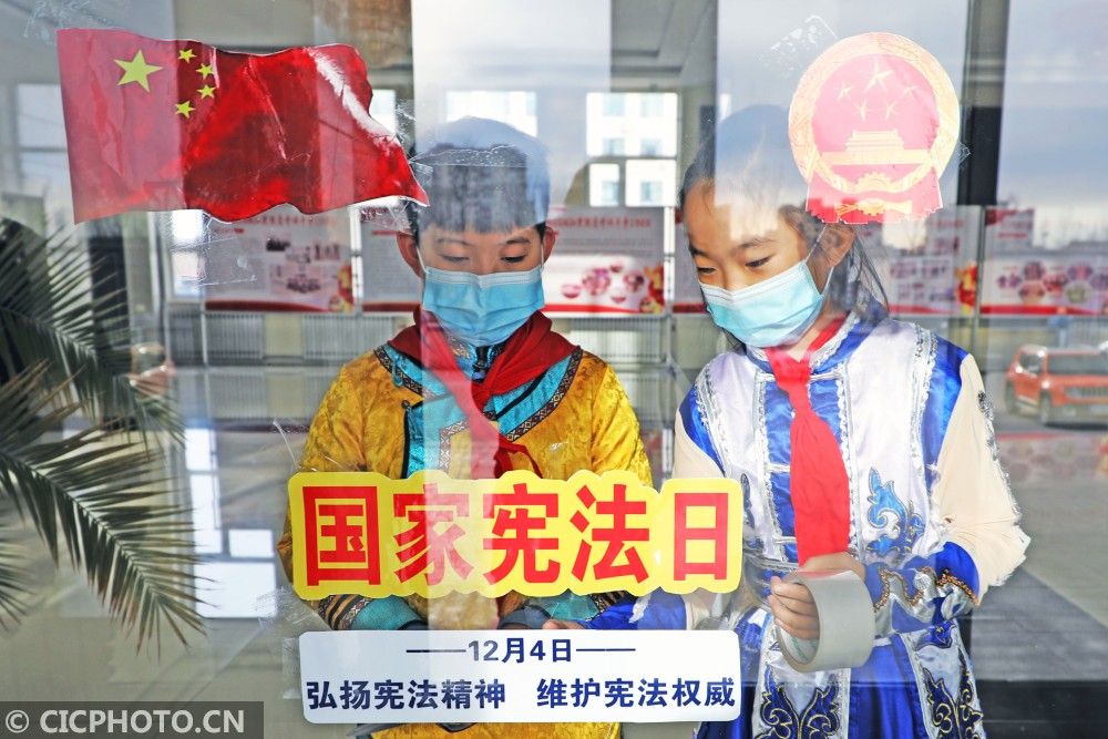 ↑2020年12月3日,内蒙古呼伦贝尔扎兰屯市民族小学学生张贴国家宪法日宣传海报。CICPHOTO/韩冷 摄