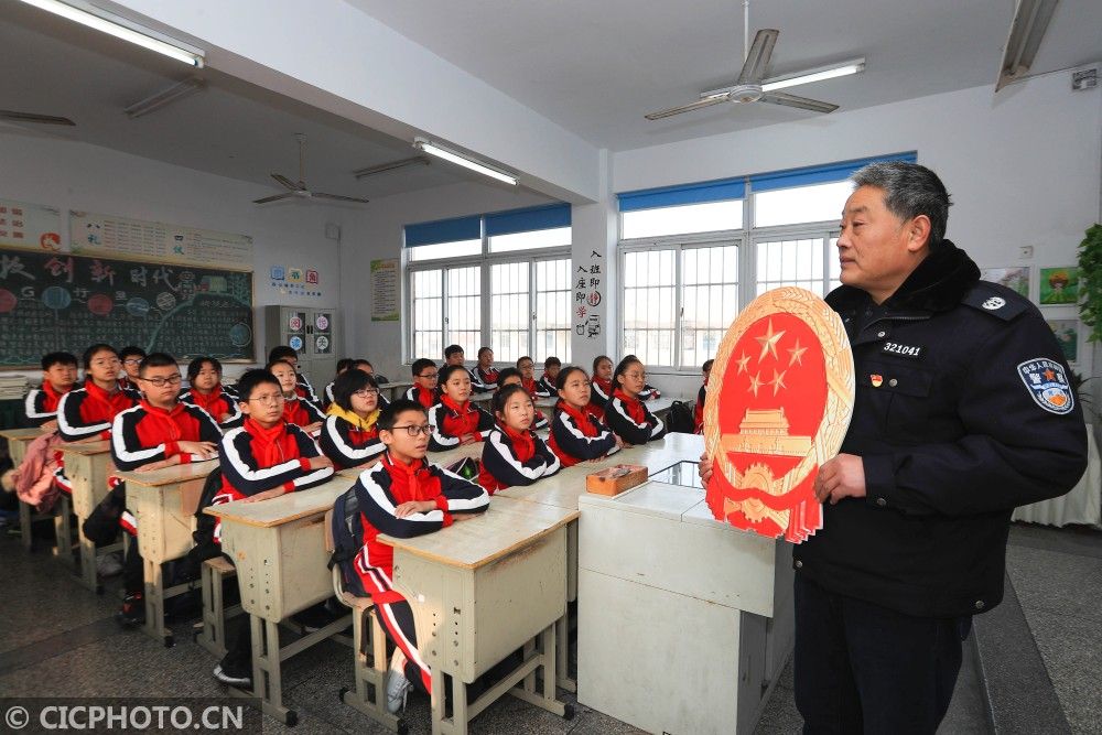 ↑2020年12月3日,江苏省泰州市海陵区苏陈镇司法所工作人员为大冯中心小学学生进行普法教育。CICPHOTO/汤德宏 摄