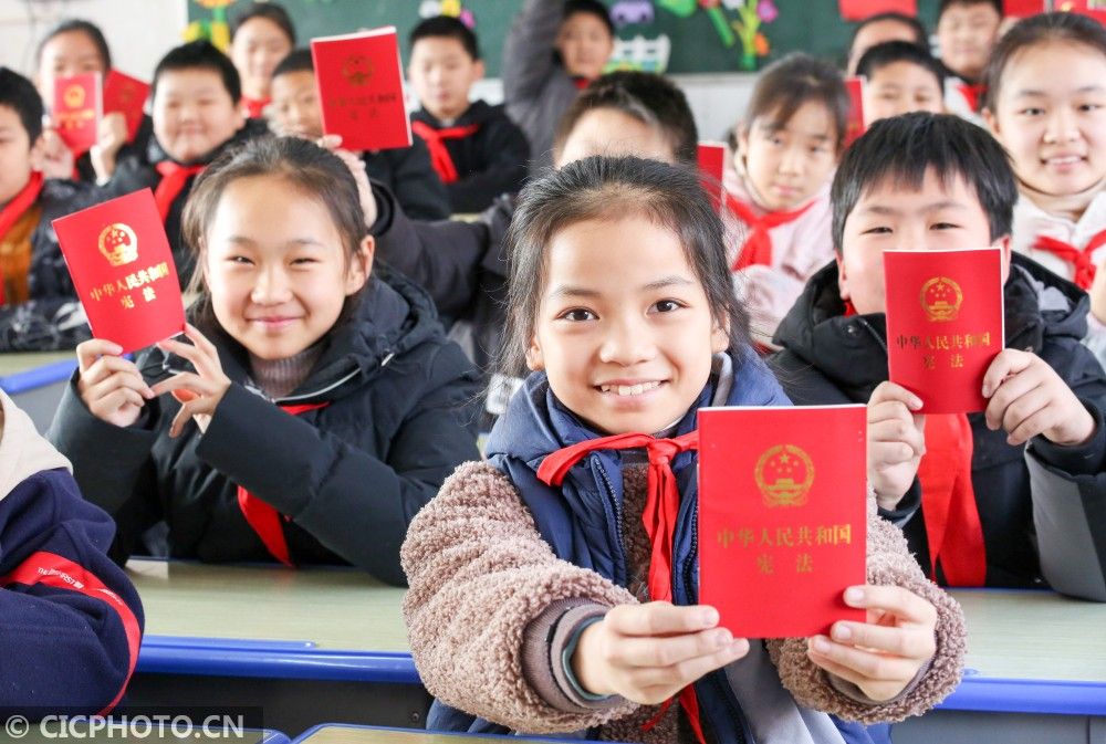 ↑2020年12月3日,山东省枣庄市市中区齐村镇齐福小学的学生们在展示法官赠送的宪法单行本。CICPHOTO/吉喆 摄