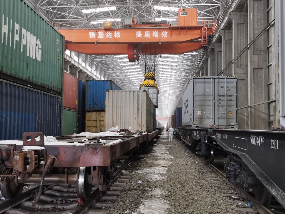 在阿拉山口站,整列中欧班列正进行集装箱换装(中国铁路阿拉山口站提供)