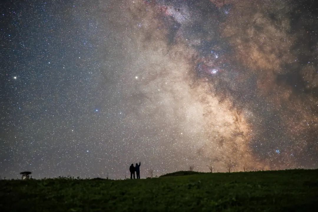 “蓬莱境界隔风烟,一带银河接九天”。夏季的夜晚,如果天气晴好,在光污染很小的环境下,会在头顶看见一道横跨天际、纵贯南北的乳白色光带,宛如河流,奔腾不息,大小星座群星璀璨,星光熠熠,这就是著名的银河。