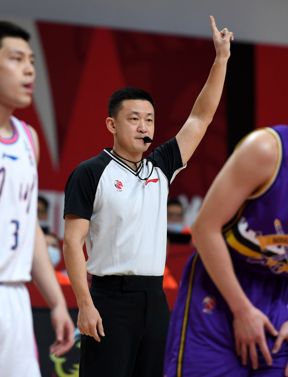 2021年1月27日,主裁判叶楠在比赛中执裁。当日,在浙江诸暨举行的2020-2021赛季中国男子篮球职业联赛(CBA)第二阶段第35轮比赛中,吉林九台农商银行队以103比93战胜天津先行者队。新华社记者黄宗治摄