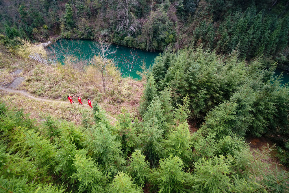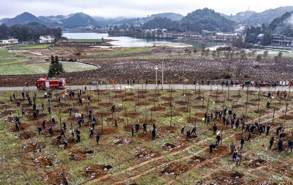 2022年2月7日,人们在贵州省铜仁市玉屏侗族自治县朱家场镇鱼塘村植树(无人机照片)。新华社发(胡攀学摄)